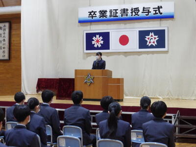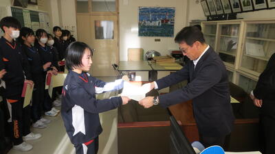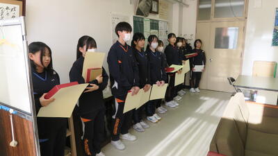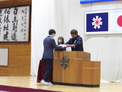 学年代表2名(石井さん・山本さん)が修了書を受け取りました。また、生徒会代表細井さんから挨拶もありました。