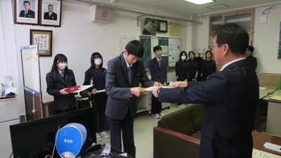 本校の生徒が授業や部活動、夏休みの課題として取り組んだ、作文コンクール、ポスターコンクールの結果が発表されて、多くの生徒が賞に選ばれました。先日、校長室で表彰状の授与を行いました。下の写真はその様子です。