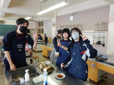 今日は2年A組が調理実習を行いました。今回の2年生の調理実習ではイカ飯、スイートポテトの他、いも餅にも挑戦しました。形を整え、焼き上げると教室に香ばしい香りが広がりました。笑顔あふれる楽しい実習になりました。