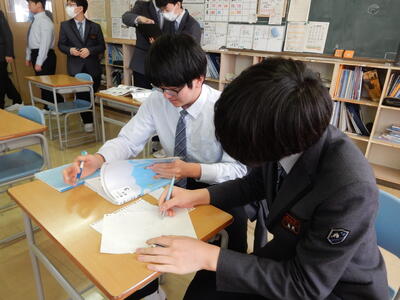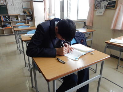中学3年生にとって、中学校生活最後となる定期テストが終了しました。休み時間は、教科書を囲んで答え合わせをしたり、タブレットで最終確認したり、と受験生らしい姿が見られました。定期テストは終わりましたが、高校入試はこれから本格化してきます。自分の目標に向かって全力で頑張っていきましょう!