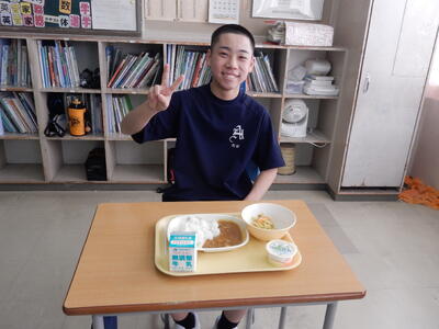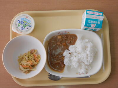 「全国学校給食週間」にあたり、昨日のメニューと1年A組の給食準備の様子を紹介します。昨日のメニューはポークカレー、ツナとキャベツのコンソメ煮、牛乳、牛乳プリンでした。