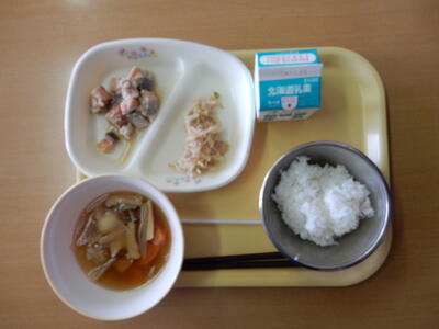 1月27日の給食は、ご飯、いも団子汁、鮭のごまかけみそ、大根のきんぴら、牛乳です。