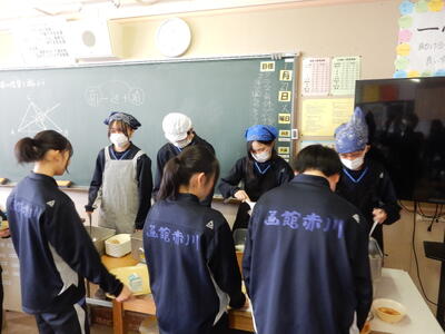 家庭科の授業で、函館の郷土料理「いかめし」作りに挑戦しました。イカの中に丁寧にお米を詰め、爪楊枝で止める作業に苦戦する場面もありましたが、班の仲間と協力して進めました。自分たちで炊き上げた「いかめし」の味は格別だったようです。地元の食文化を学ぶ、充実した実習となりました。