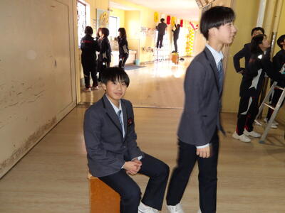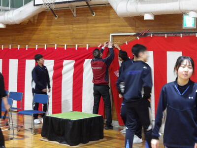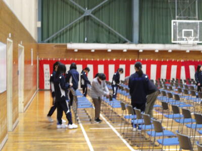 今週の月曜日と火曜日に卒業式に向け1、2年生で会場設営を行いました。2年生はステージの設営、1年生は紅白幕の取り付けや控え室の掃除を行いました。写真は1年生の活動の様子です。