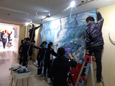 体育館の渡り廊下を、生徒会や総合文化部のみなさんで、飾り付けしている様子です。