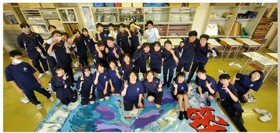 その後裏をガムテープで止める。 表に戻して余っている部分を糊付け。最後にみんなサインをして完成。