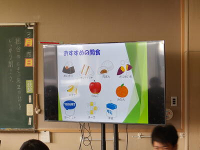 また、後半には「おすすめの間食」として、おにぎりや果物、乳製品などが紹介されました。
